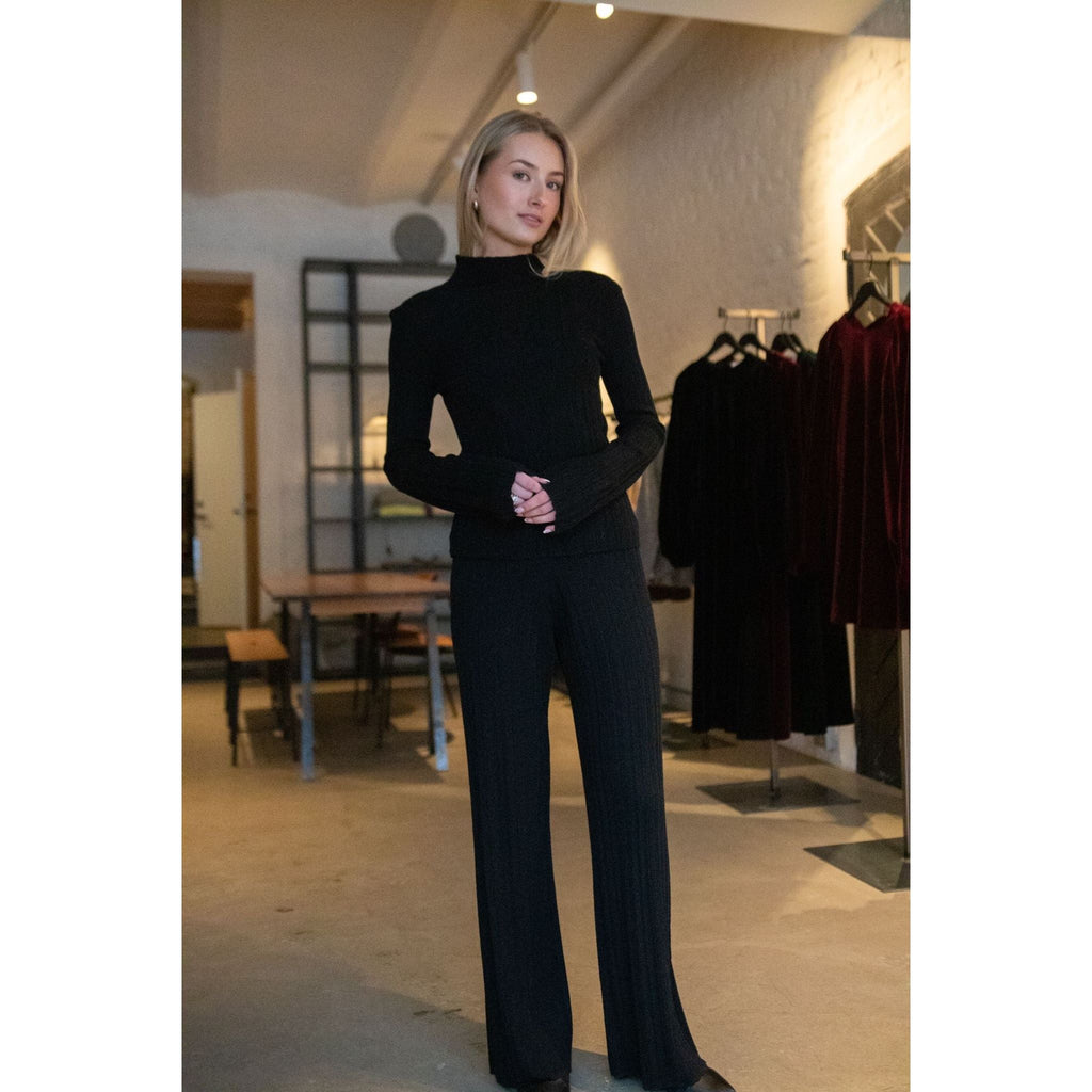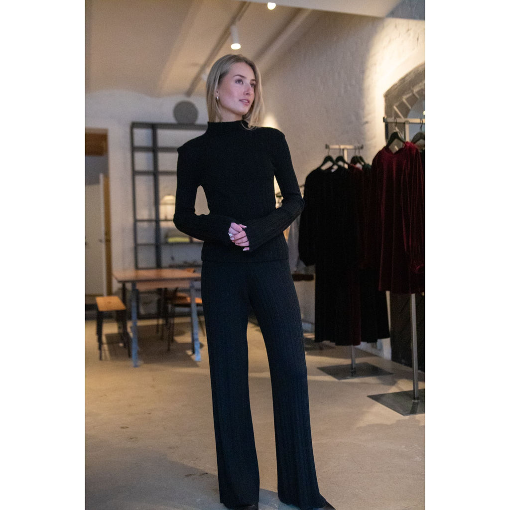 Elegant topp laget i ein mjuk, ribbestrikket ullkvalitet. Modellen er designet med høg båthals, smale, lett utsvingte ermer og har ein ettersittende fasong.