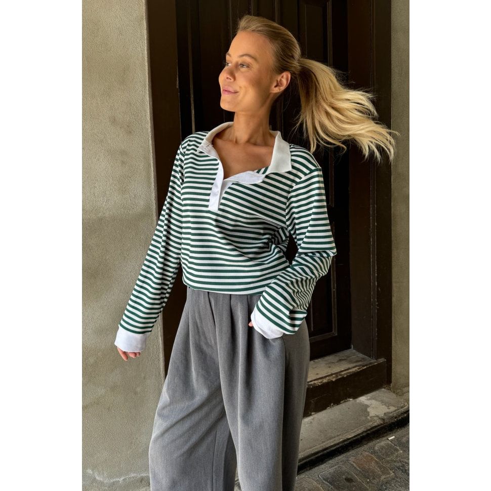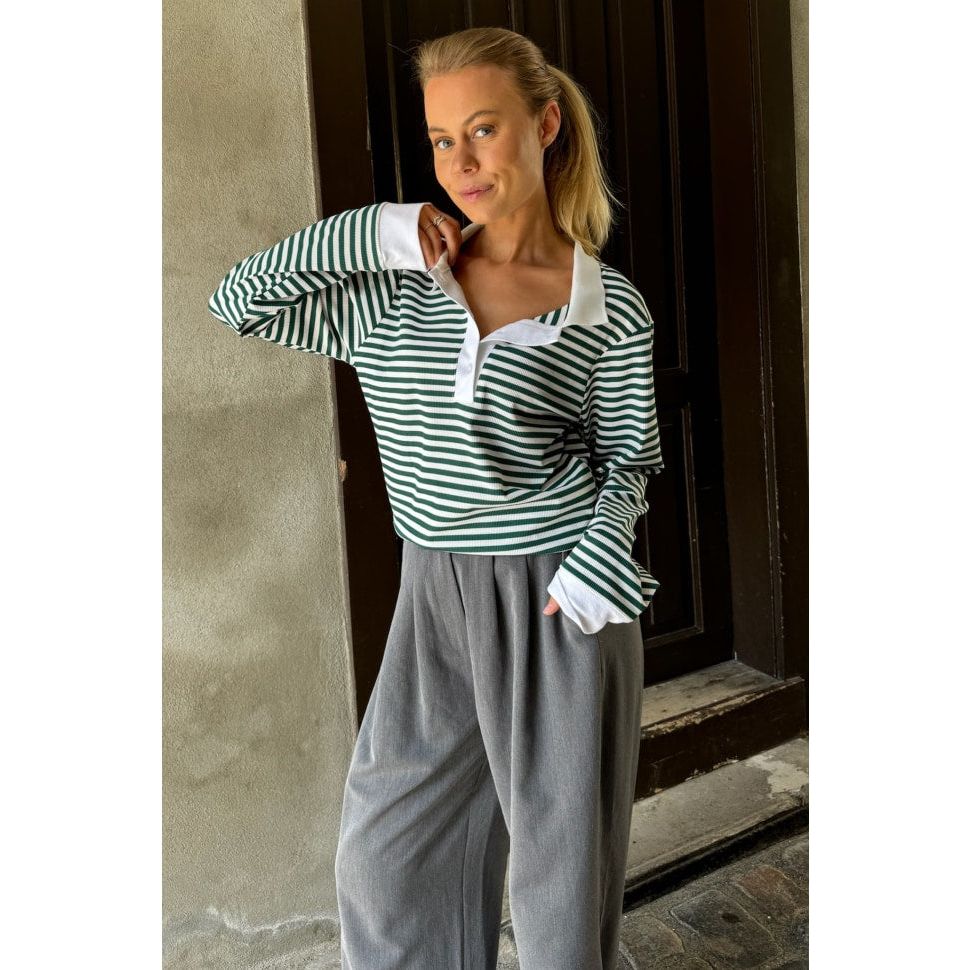 Stripete polo med 3 knapper foran, kvit krage og mansjetter. Stretchy og ribbet stoff.