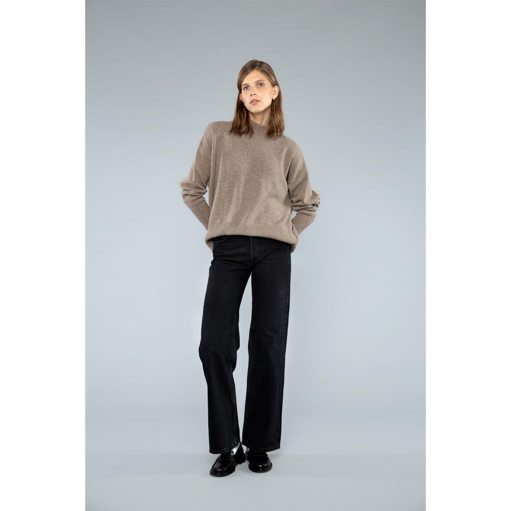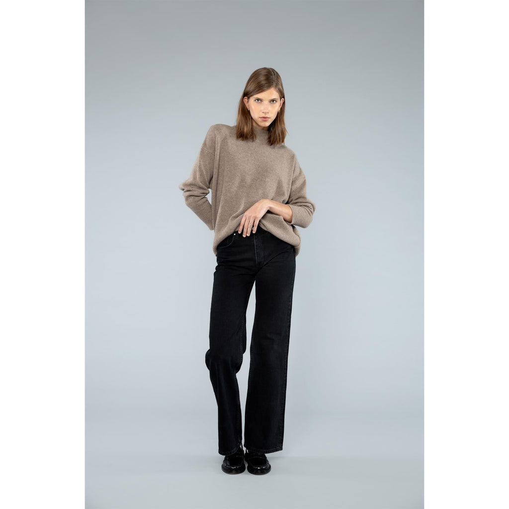Høghalset oversized genser med splitt i siden. Genseren har eit lengre bakstykke og er laget av bærekraftig garn, blandet med resirkulert ull. Ribbestrikk i hals, mansjetter og kant.