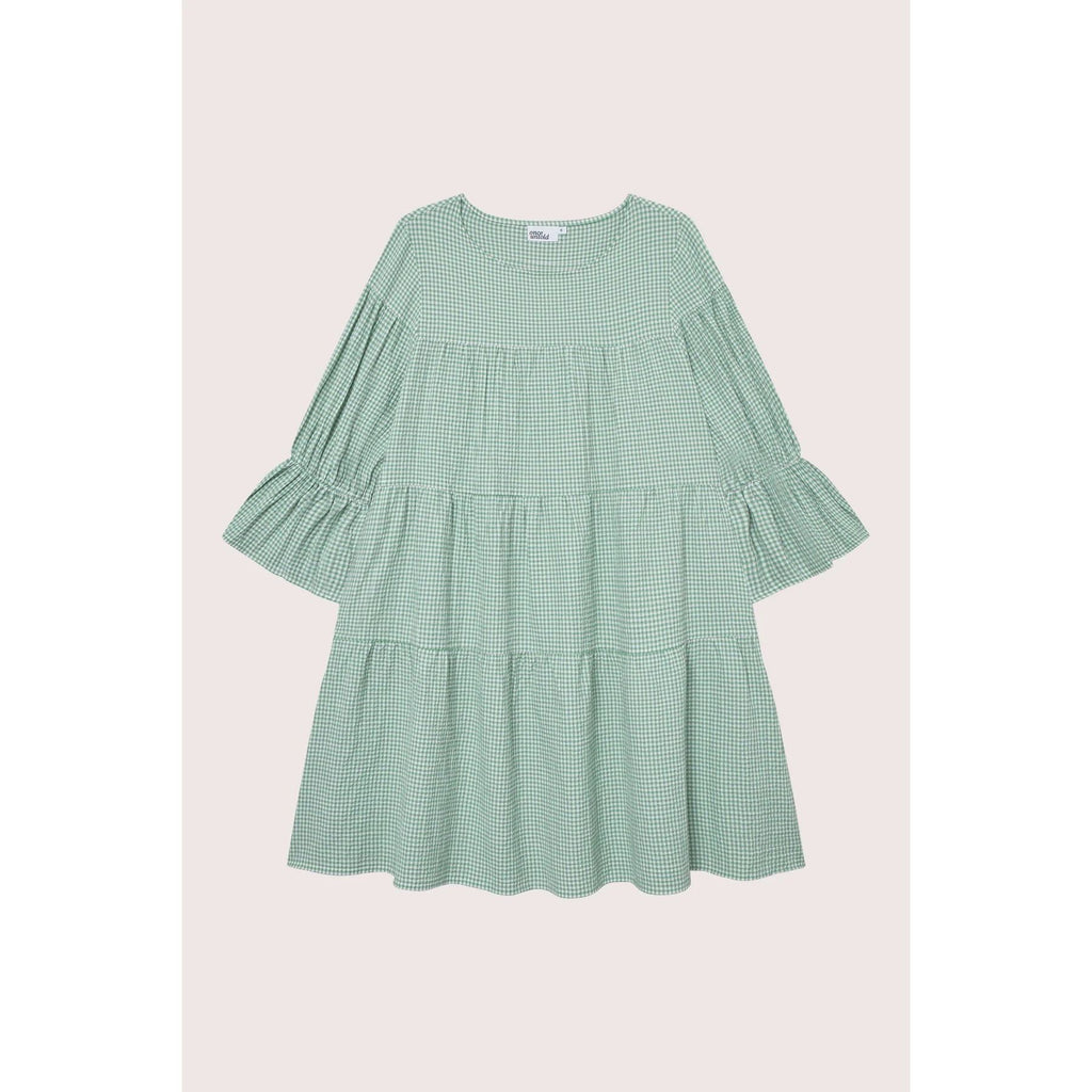 Indiana-kjolen er ein flatterende minikjole med eit oversized utseende og eit rutete mønster. Kjolen har avrundet hals og brede trekvartlange ermer. Kjolen har også synlige sømmer som løper rett over kjolen og ermene, noe som gir kjolen et utsvingt utseende og fasong.