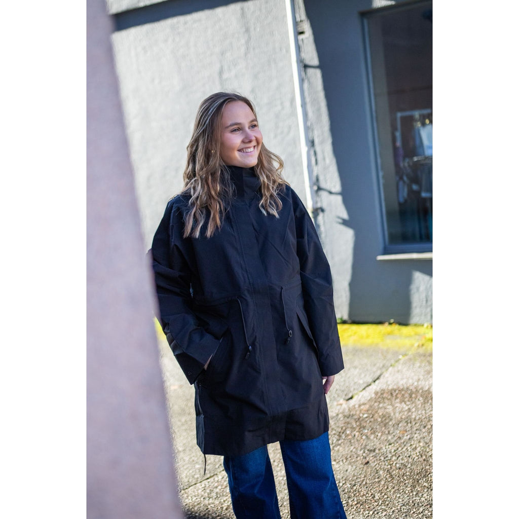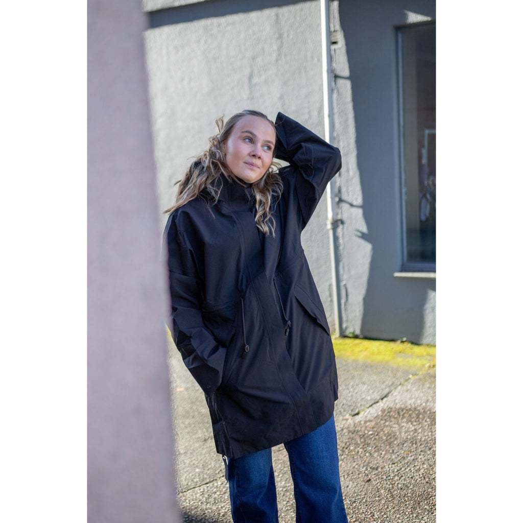Jakka er laga av eit høgkvalitets 3-lags skallstoff som er både vanntett, pustande og vindavstøytande. Ho har droppskuldre og ei vid passform, men den justerbare snora i livet gjer at ho kan tilpassast etter ynskje.
