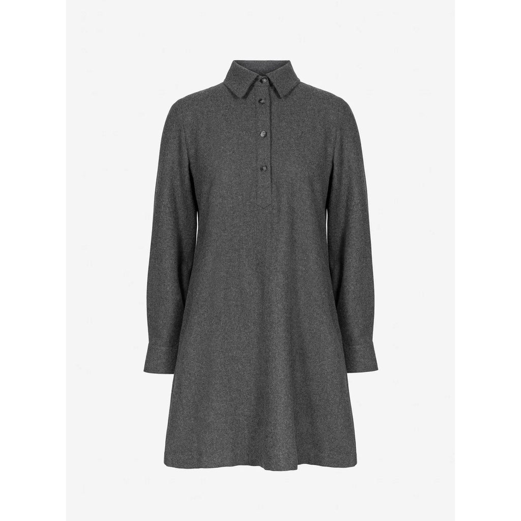 A-forma kjole i eit mjukt og behageleg ullblandingsstoff. Kjolen har halv knappestolpe, brystlommer og klassisk krage. Ein vendt legg i ryggen gir ekstra rørsle og ein fin silhuett