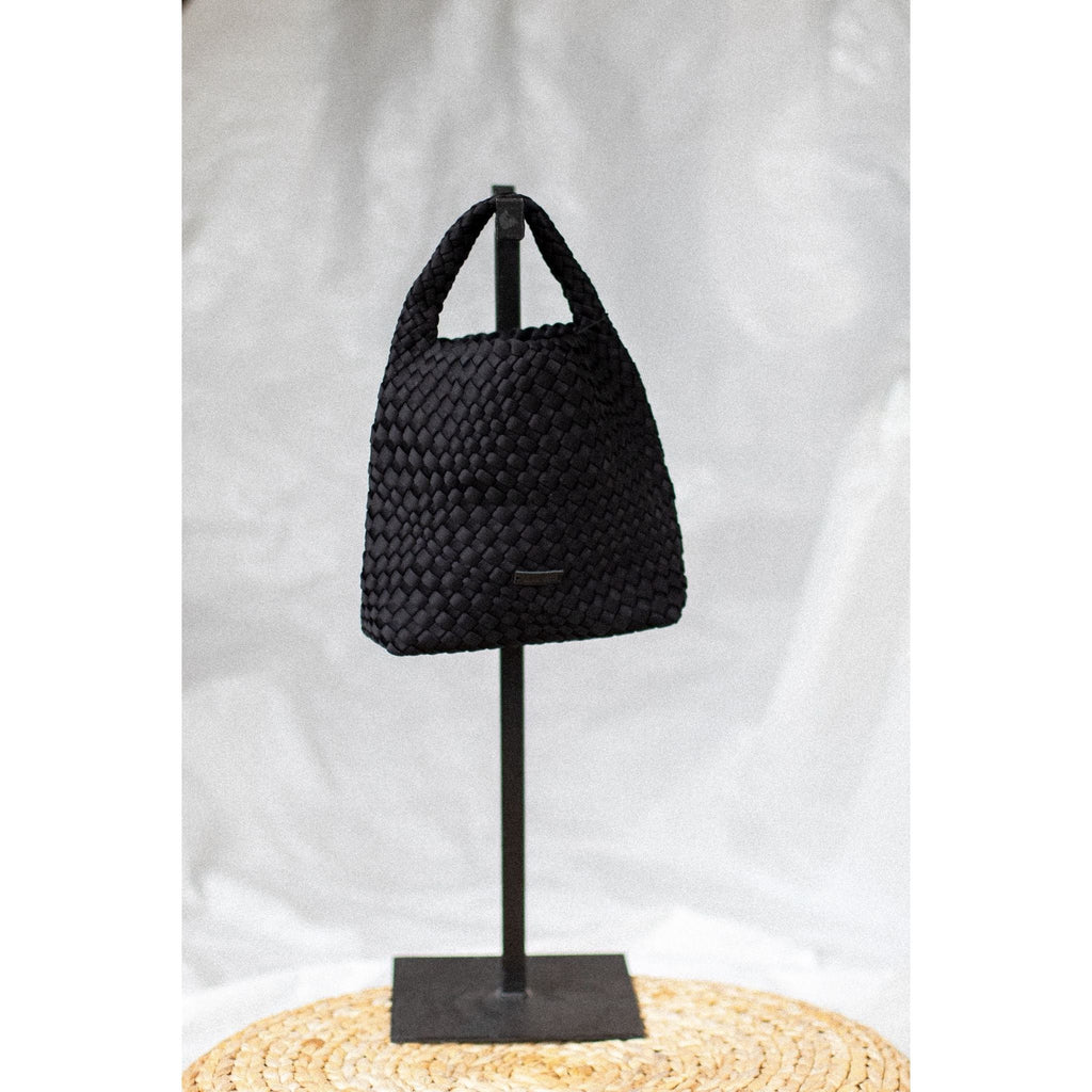Denne handveska er handflett i eitt stykke av eit oppgradert neoprenmateriale med mjuk og fleksibel struktur. Botnen er forsterka for ekstra stabilitet, og veska lukkast med ein diskret magnetknapp. Avtakbar reim i skinnimitasjon.