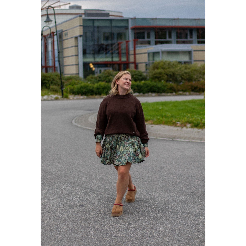 Ein romantisk kjole i gobelinstoff med blomstertrykk. Kjolen har klassisk krage, knappelukking i front, låg midje og ein rysja fald som gir eit feminint og særeige uttrykk. Perfekt til både kvardags og spesielle anledningar.