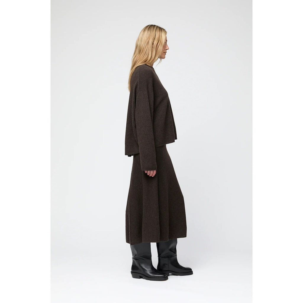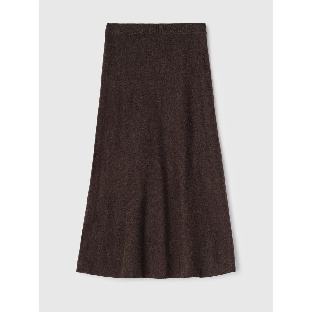 Eit stilreint midiskjørt strikka i børsta, ekstrafin merinoull for ein luksuriøs og mjuk finish. Skjørtet har ei lett A-forma silhuett og elastisk linning som gir både komfort og ein flatterande passform.