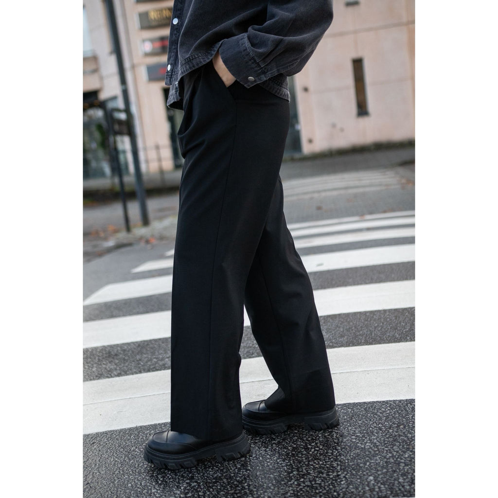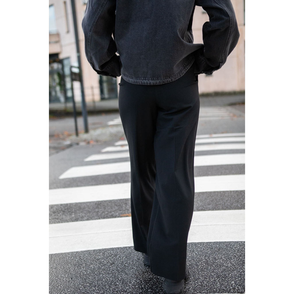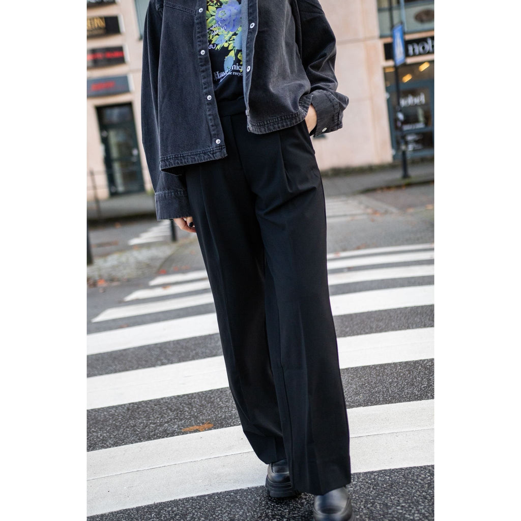 Desse stilreine buksene er sydd i eit melert stoff med enkel vev, og har ei rett og vid passform som gir eit moderne, avslappa uttrykk. Buksene sit i midja og har ei forlenga hektelukking som gir ei rein og elegant silhuett. Pressefoldar og falske baklommer med passepoil gir eit gjennomført, dressa preg.