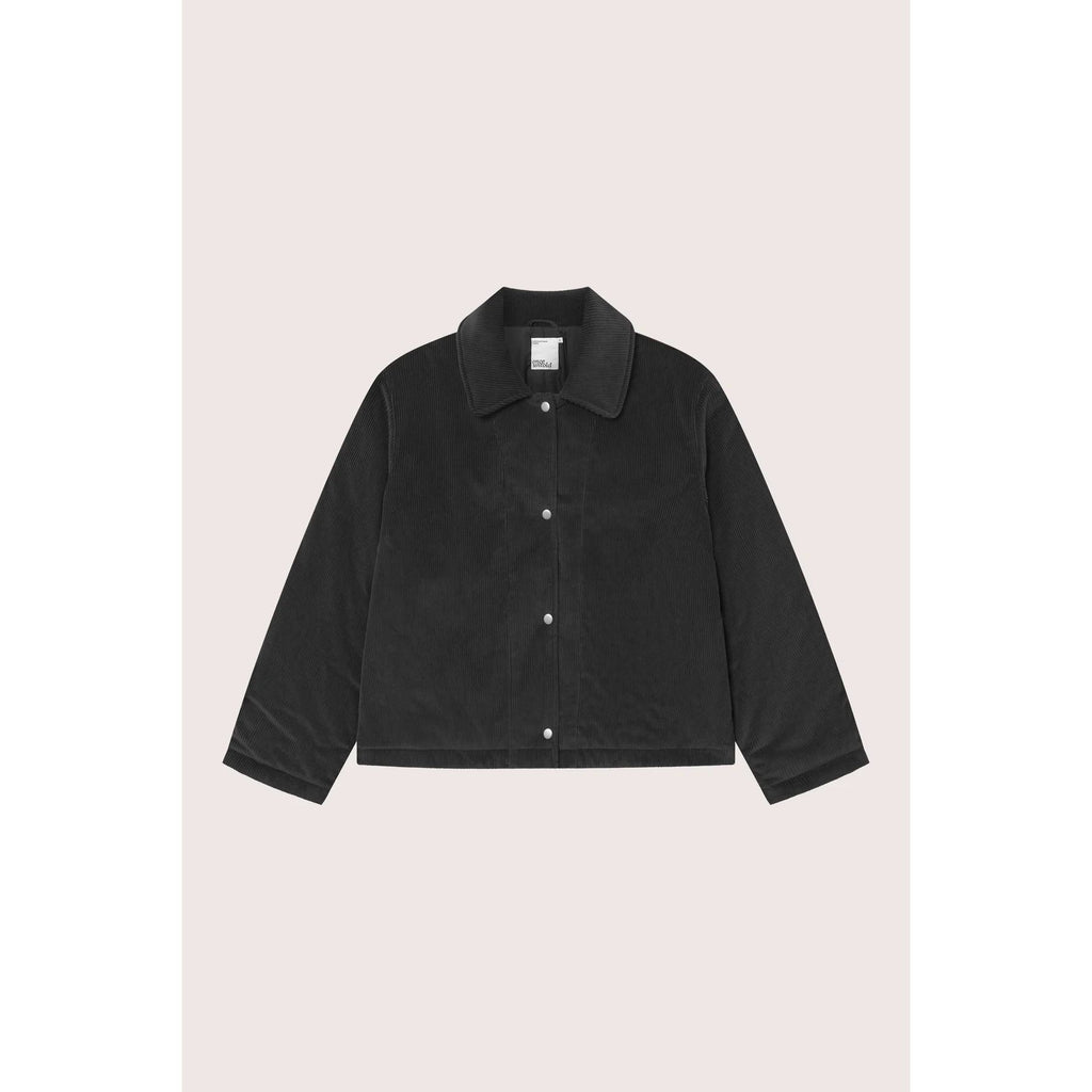 Ei oversized jakke som kombinerer komfort med moderne minimalisme. Laga i mjuk kordfløyel med diskret vertikal struktur. Jakka har droppa skuldrer, trykknappar i front og snøring i kanten for justerbar passform.