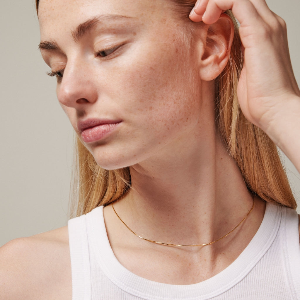 Box Chain halskjede i 925 sterlingsølv er eit firkanta kjede med eit skarpt og særprega uttrykk. Den glansfulle overflata gir eit stilreint og moderne preg.