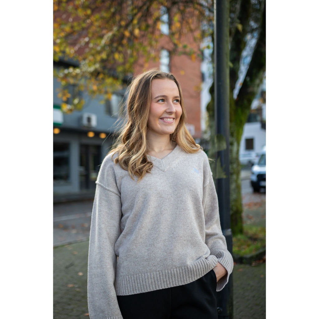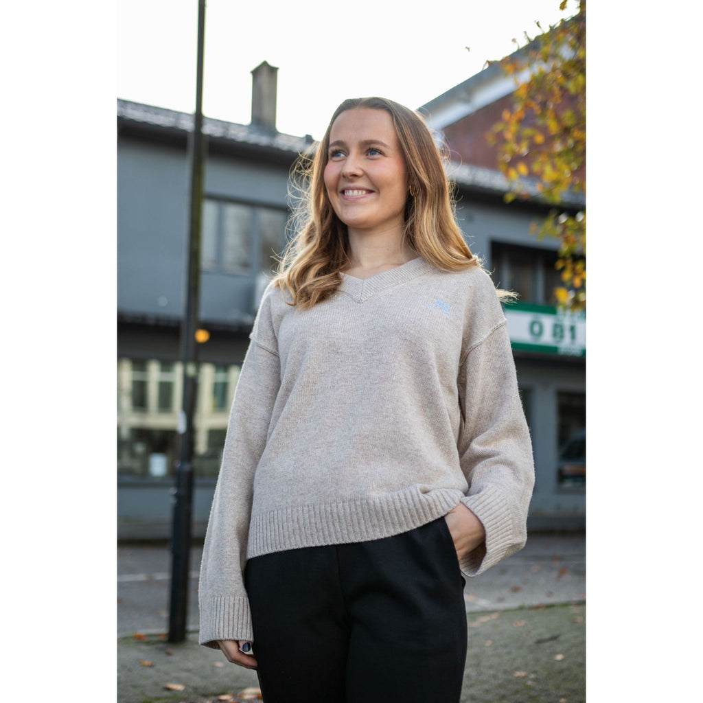 Denne genseren har V-hals, ribbestrikkede kanter og GANNI-logo i blå kontrastfarge.