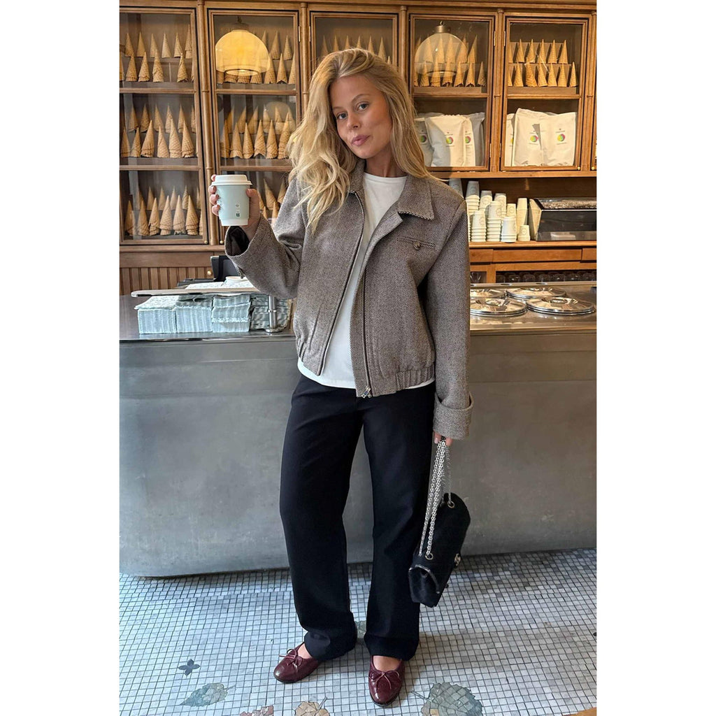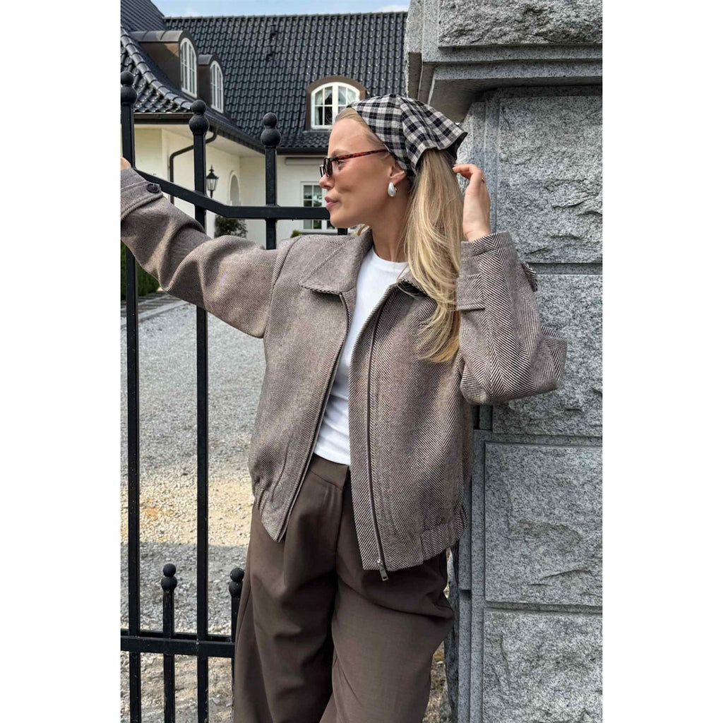 Ei kort jakke med klassisk fiskebensmønster som gir eit tidlaust og strukturert uttrykk. Jakka har glidelås i front og ein avslappa passform. Den elastiske kanten nedst gjer at jakka sit fint og gir ei feminin silhuett.