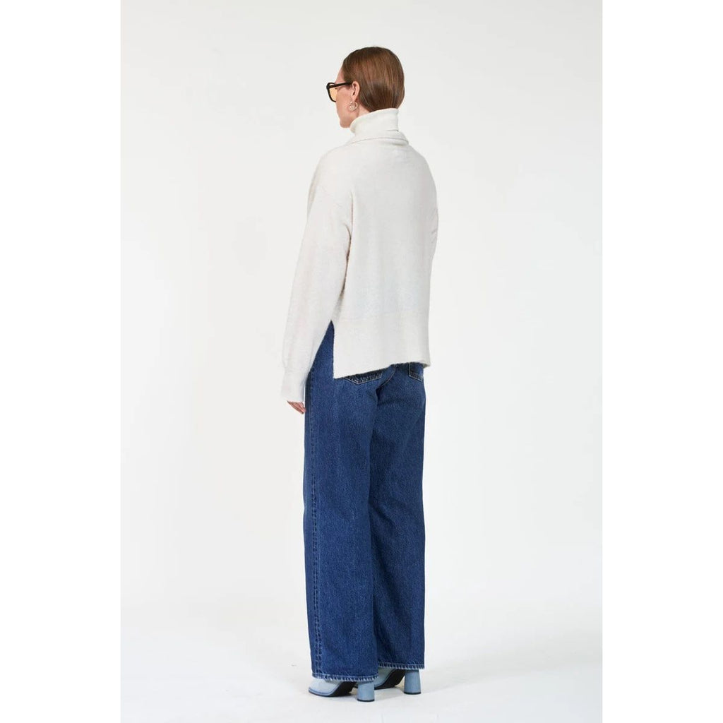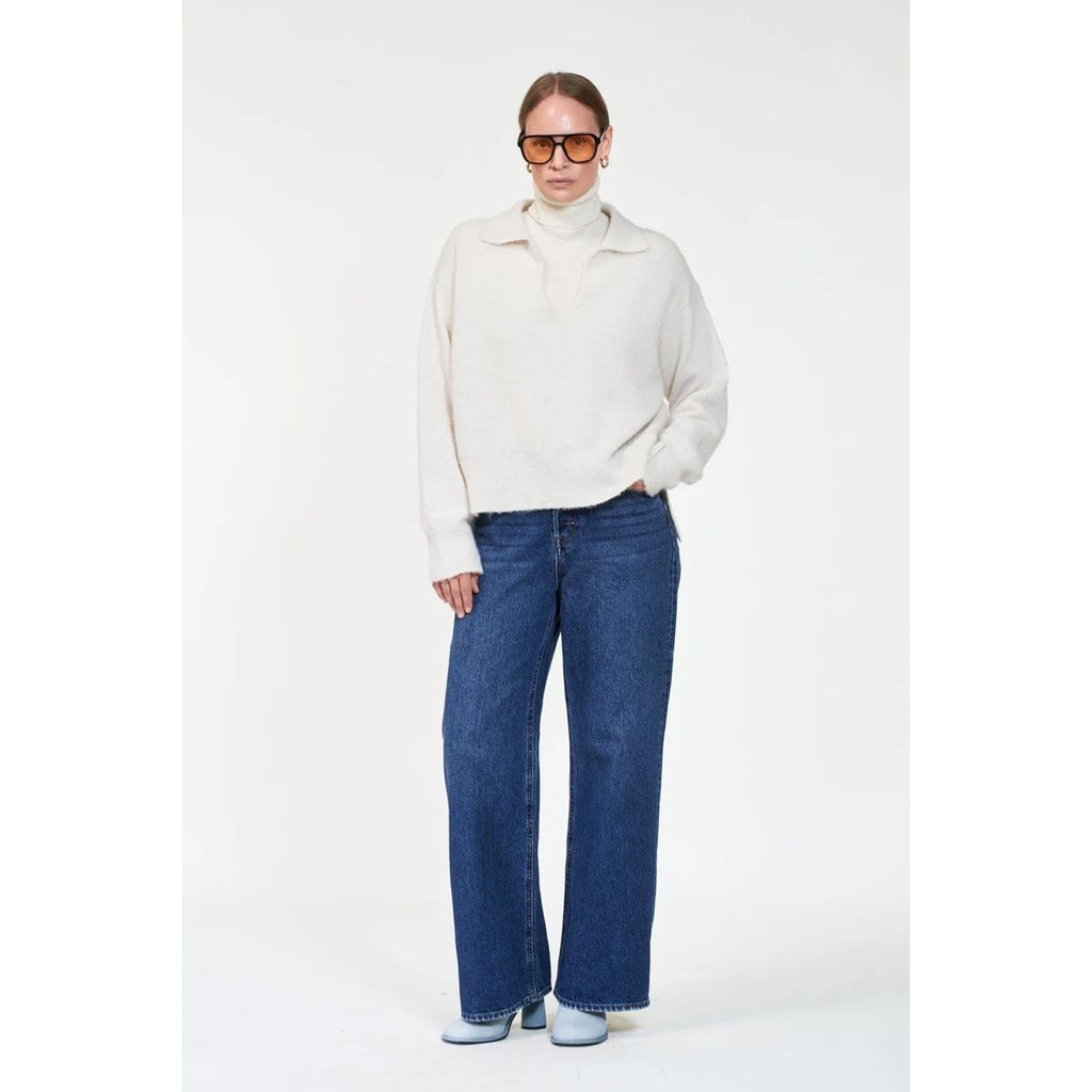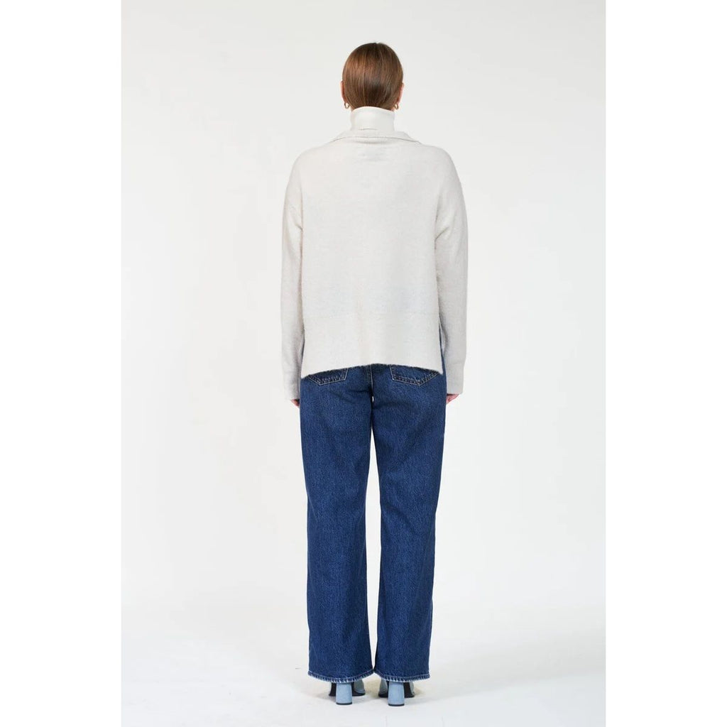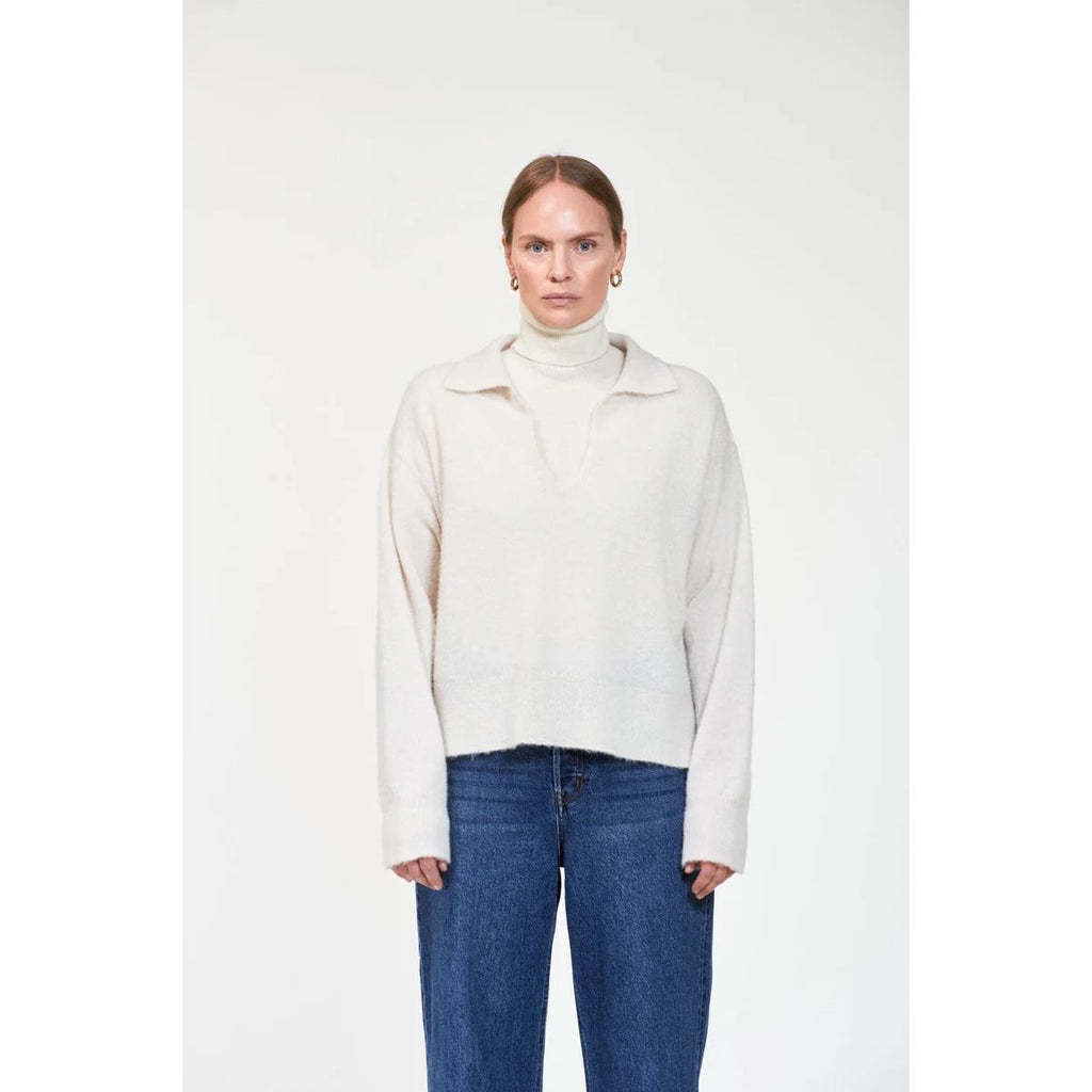 Lettvektig genser i mjuk alpakka-blanding med V-utringing, splitt i sidene og ribbestrikka krage, mansjettar og hem. Rett til noko avslappa fasong.