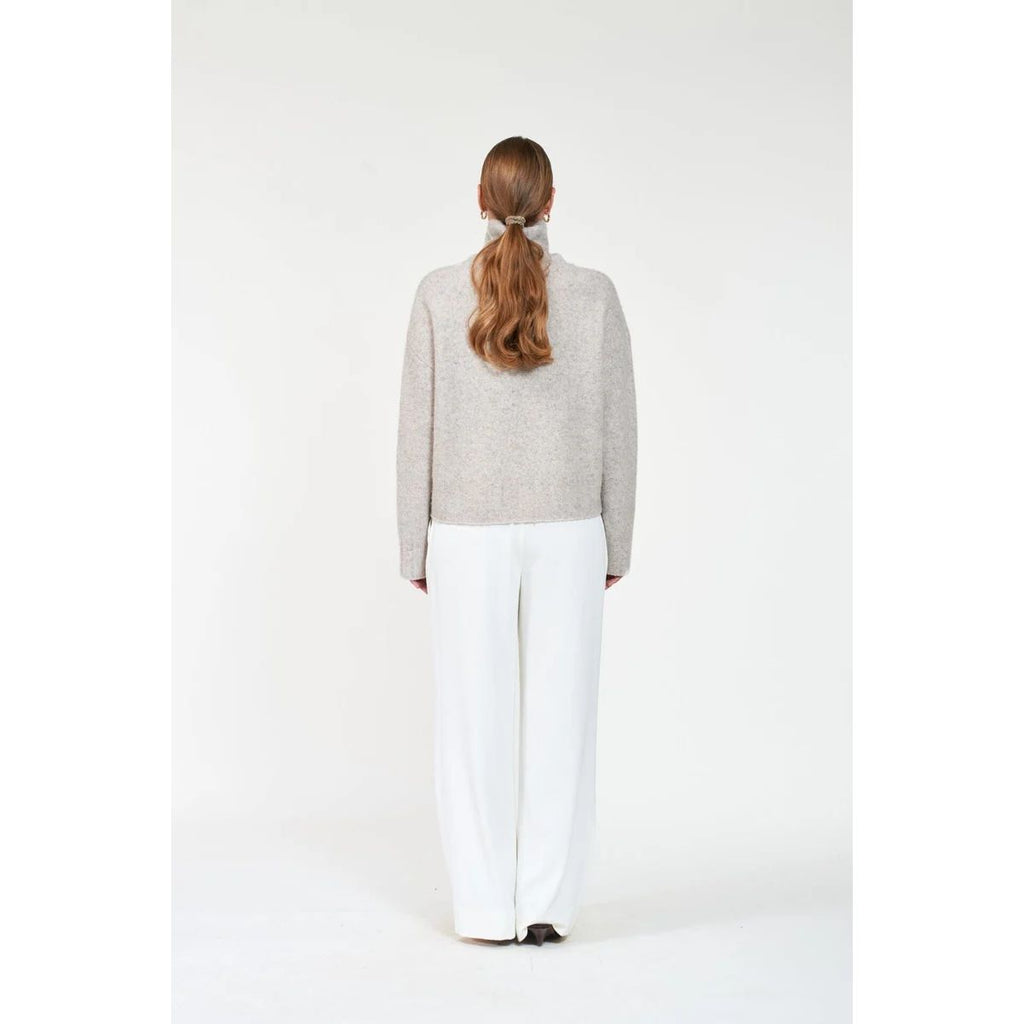 Elegant genser i mjuk og stretchy ullblanding med høg hals. Laustsittande passform med delikate ribbestrikka detaljar rundt mansjettar og hem.