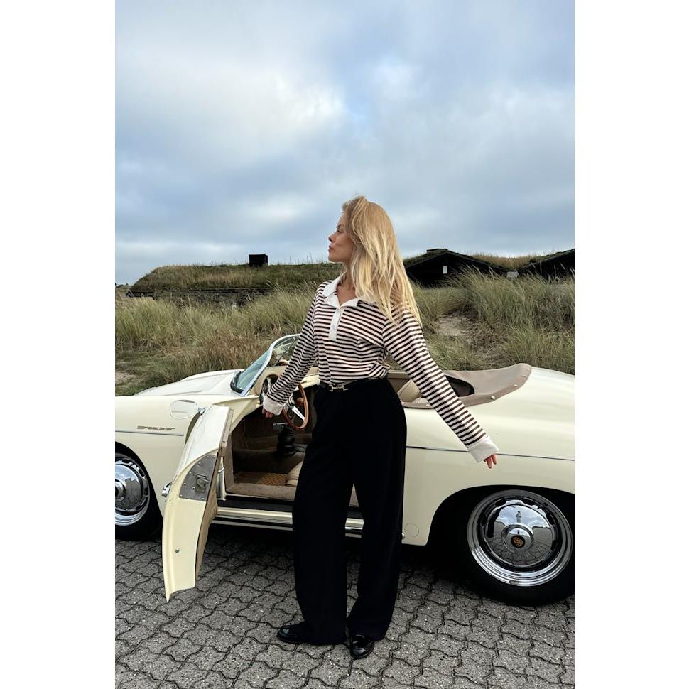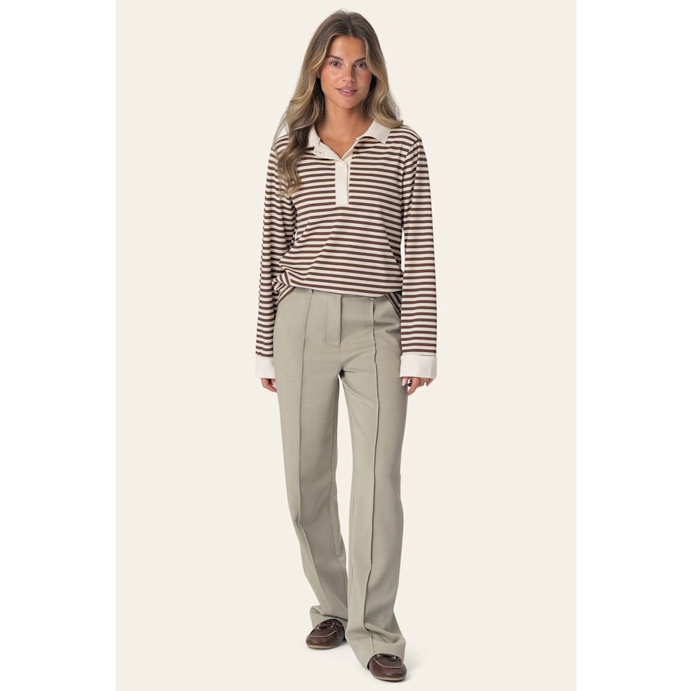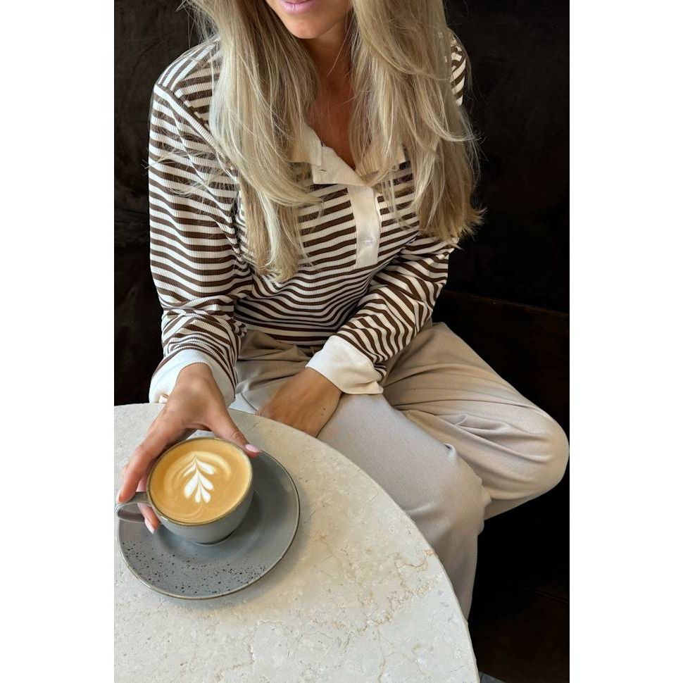 Stilrein poloskjorte med brune og kvite striper. Har lange, rette ermar avslutta med breie kvite mansjettar for eit reint og strukturert uttrykk. Skjorta har klassisk kvit krage og tre knappar, slik at ho kan brukast heilt knept eller open i ein V-form.
