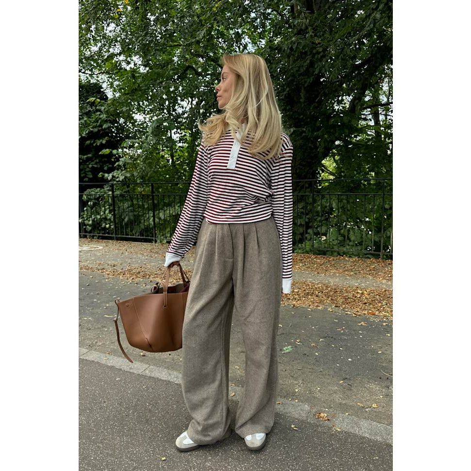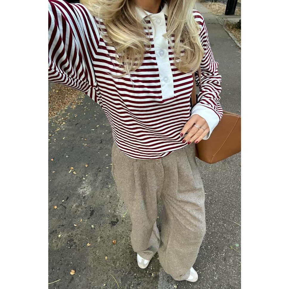 Stilrein poloskjorte med brune og kvite striper. Har lange, rette ermar avslutta med breie kvite mansjettar for eit reint og strukturert uttrykk. Skjorta har klassisk kvit krage og tre knappar, slik at ho kan brukast heilt knept eller open i ein V-form.