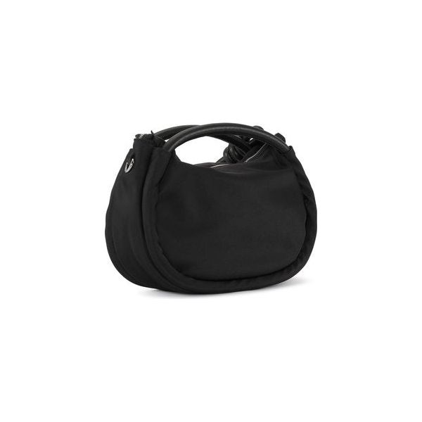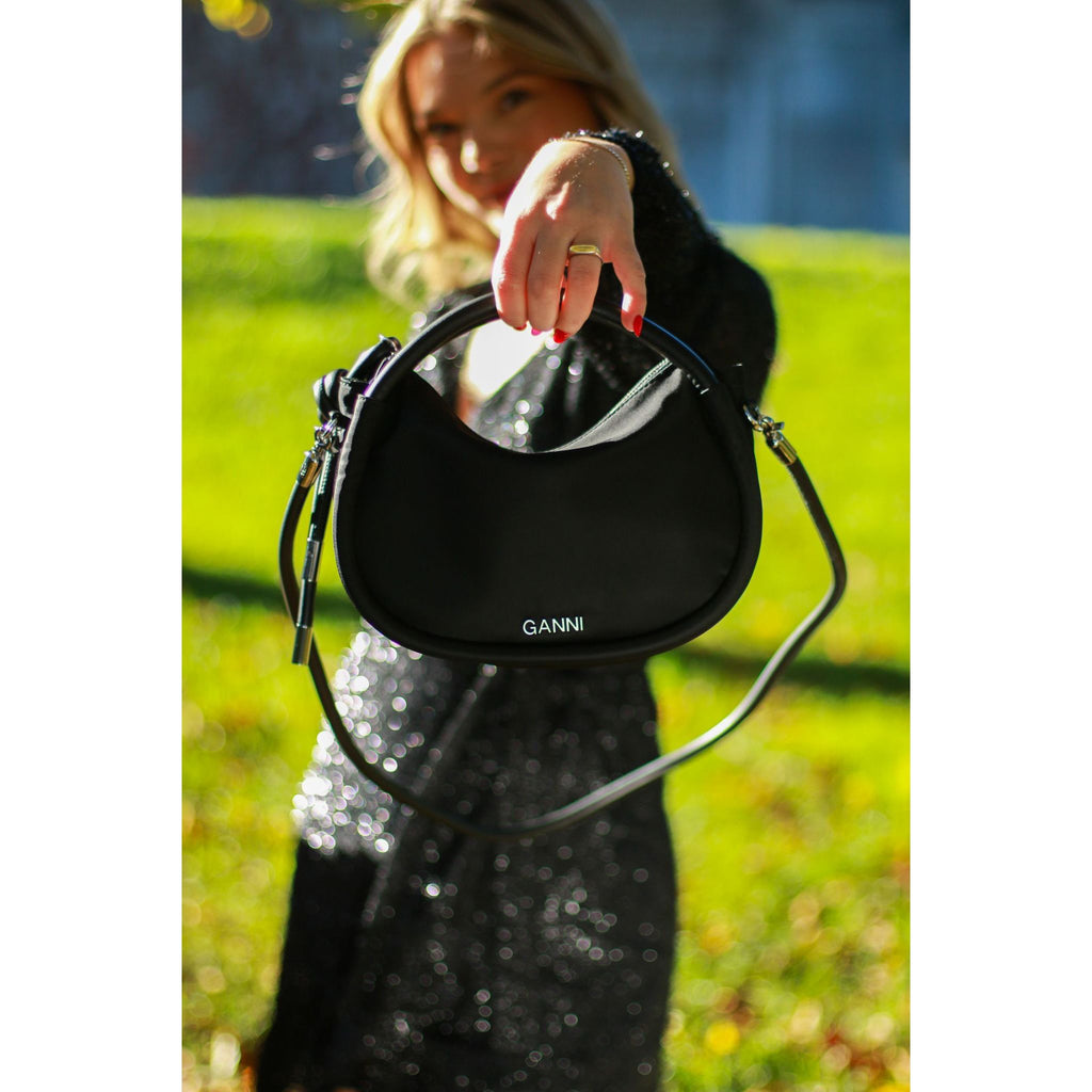 Vesken har håndtak med knuter, glidelåslukking, avtakbar stropp og ein sølvfarget GANNI logo.