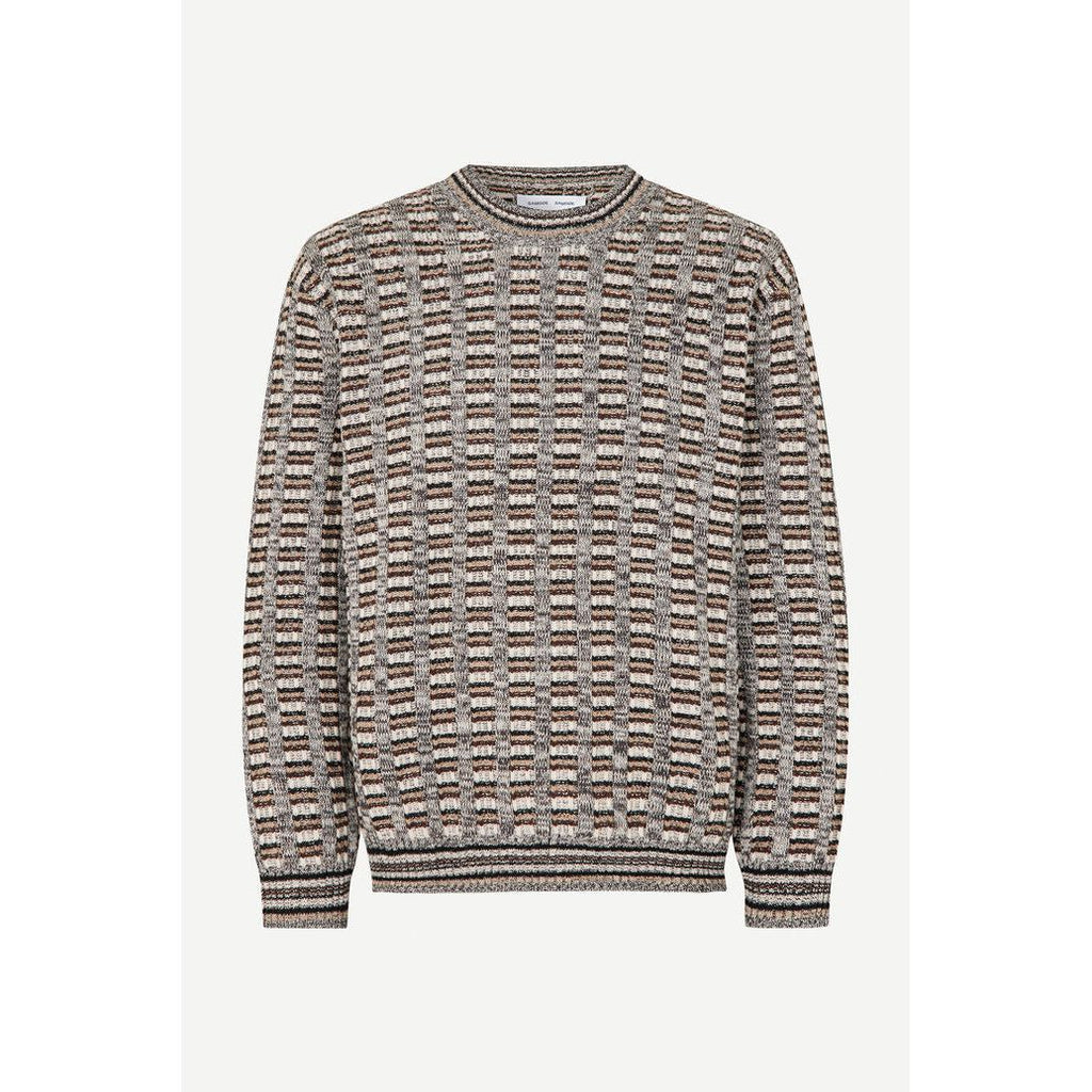 Strikkegenser med stripete grafisk sømstruktur.