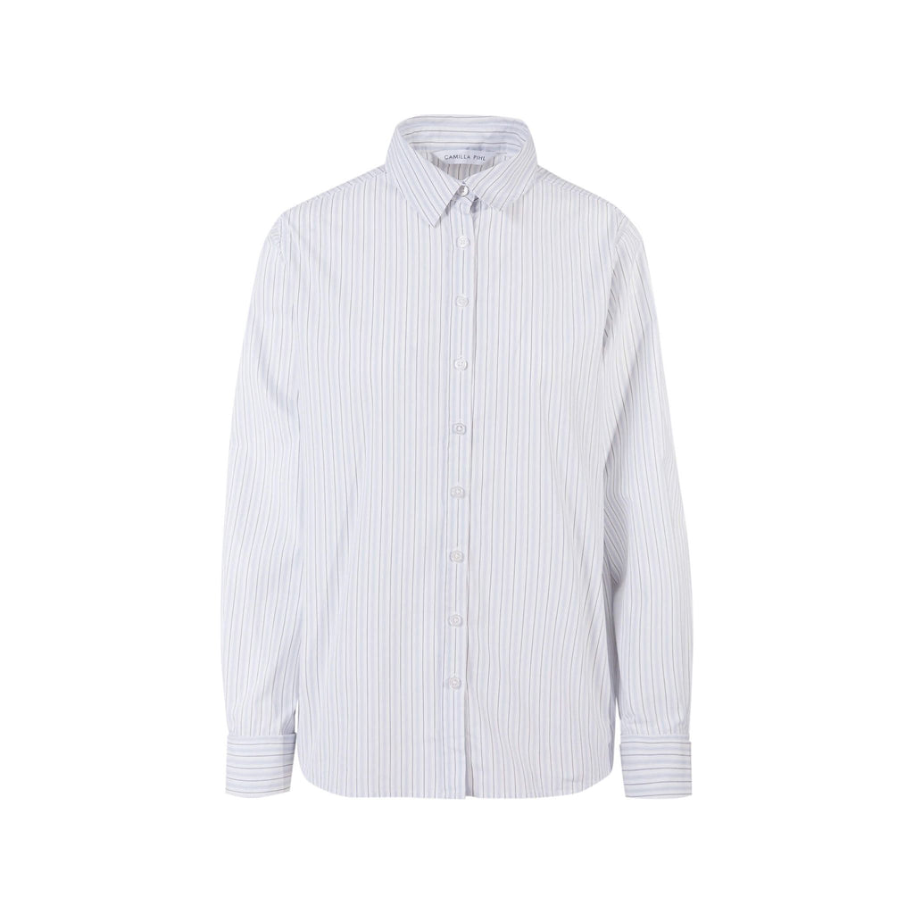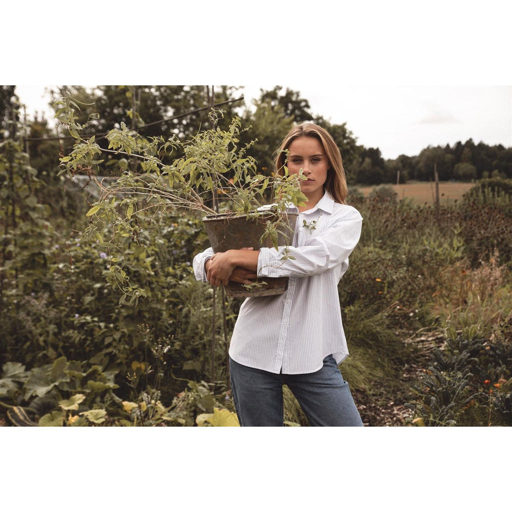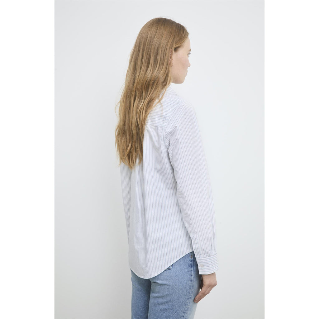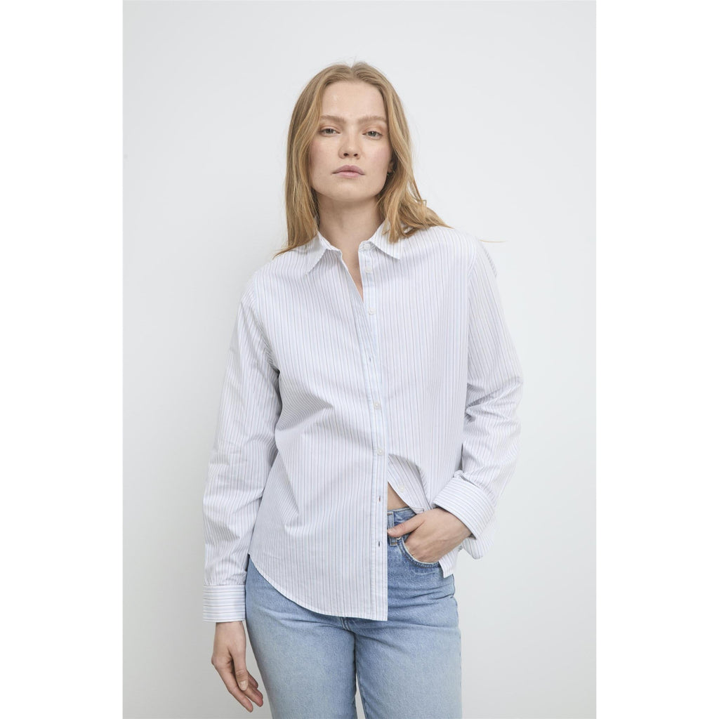 Designa med senkede skuldre, lange ermer og foldede mansjetter med knapper og ein skjortehalekant.